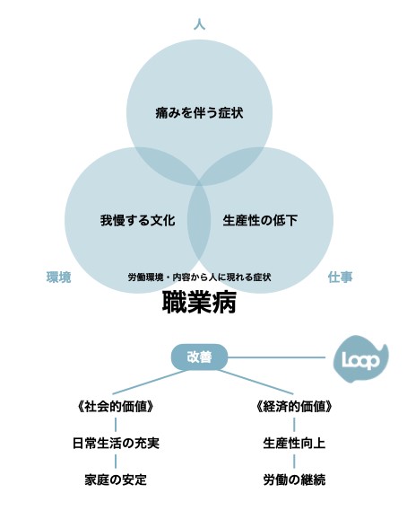 「しごと」と「くらし」にベストをつくる 「ともに創る幸循環」 Service 療法士視点の課題解決型健康経営「loop」 誰もが諦めている「職業病」に挑む 例えば腰痛による経済損失は日本全体で3兆円どんな職業にも「職業病」が存在します。重たいものを運び続ける、パソコン画面を見続けるなど職業の特性や職場の環境によってそれは異なります。「この職業に就いている以上、仕方がない」「みんなだって我慢している」この考えが「職業病」を放置することになり、目、肩、腰など体に様々な症状を引き起こし、生産性に影響を与えるだけでなく、時には休職・退職に発展してしまいます。 作業療法士・理学療法士の視点改善へのアプローチ 現場分析による健康支援で個人の痛みの原因や対処方法を変化させるだけでなく、目には見えない暮らしの中の課題を見つけ、お互いに支え合える文化を創造します。 VIEW MORE 創業者・作業療法士 田代 涼 News 栃木の建設·製造·健康経営はLoopにお任せください 製造業・建設業でも重... 企業様と共に創り上げた健康経営の取り組みが地元新聞に掲載! 弊社の健康経営支援「... 療法士視点の課題解決型健康経営「loop」とは 「療法士視点の課題解... Load More